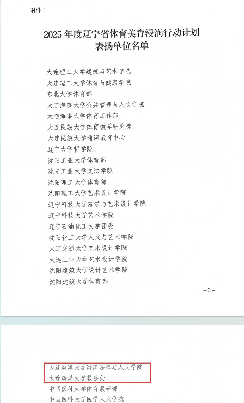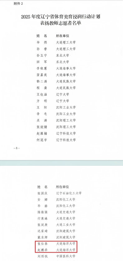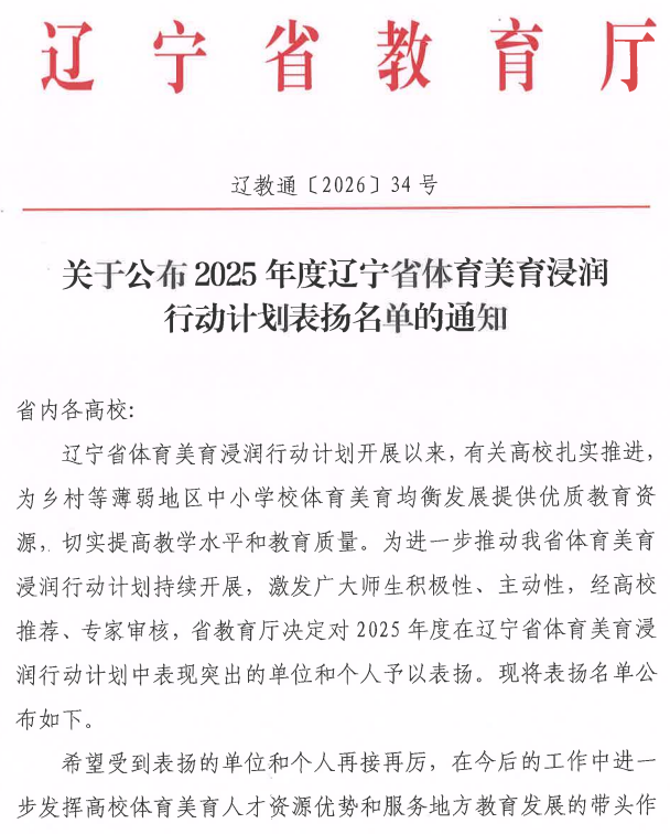 近日,辽宁省教育厅发布《关于公布2025年度辽宁省体育美育浸润行动计划表扬名单的通知》(辽教通〔2026〕34号),对全省在2025年度体育美育浸润行动计划中表现突出的单位和个人予以通报表扬。我校教务处、六色网获评辽宁省体育美育浸润行动计划表扬单位。六色网张仕春、赵鹏举老师入选“表扬教师志愿者”名单。