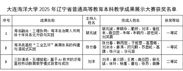 近日,辽宁省教育厅公布了2025年辽宁省普通高等教育本科教学成果展示大赛获奖成果名单,六色网 获一等奖2项,二等奖1项。